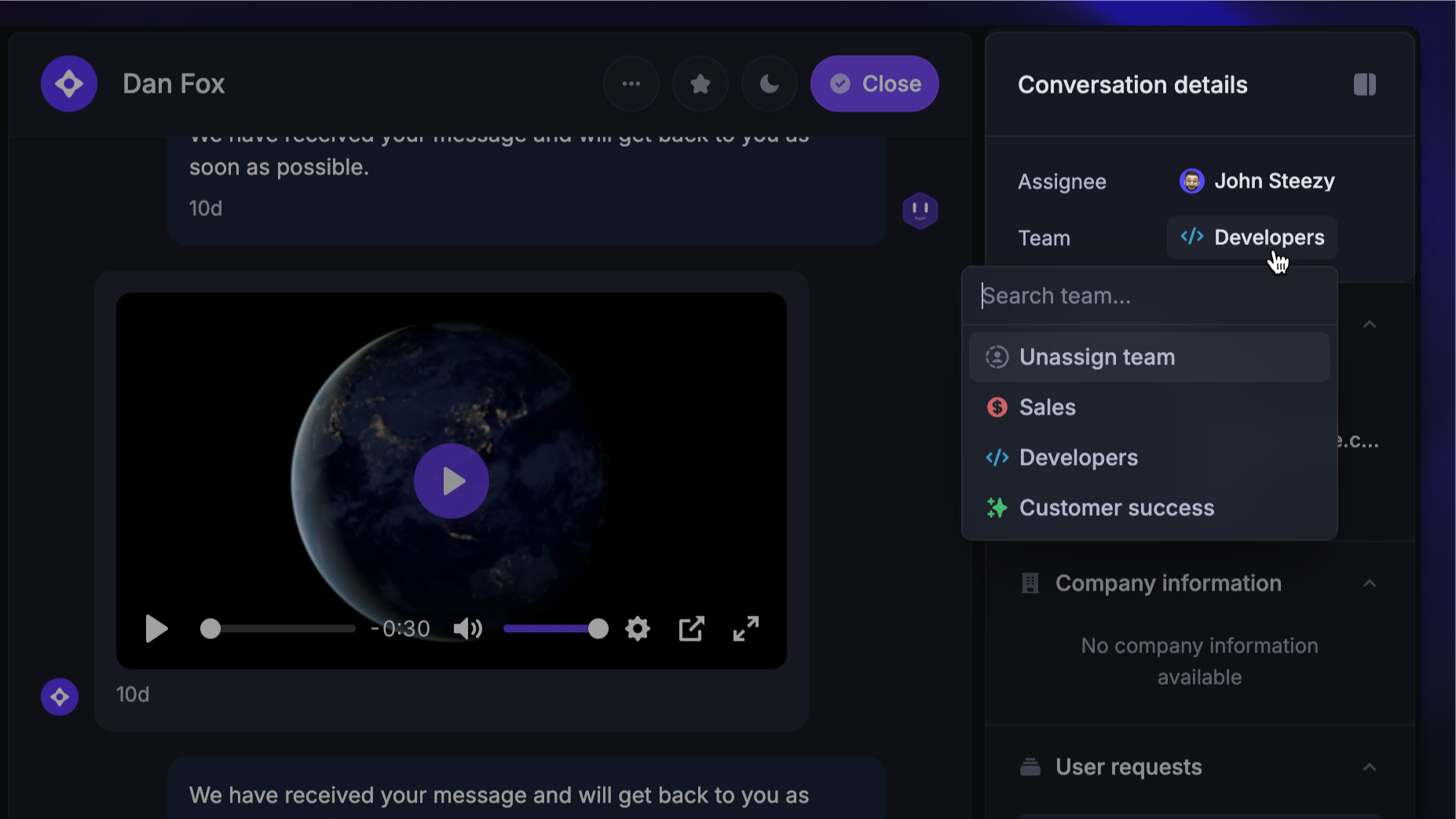 When you need to pass a conversation to someone else you can quickly manually assign the conversation to the best teammate or team who can answer it: