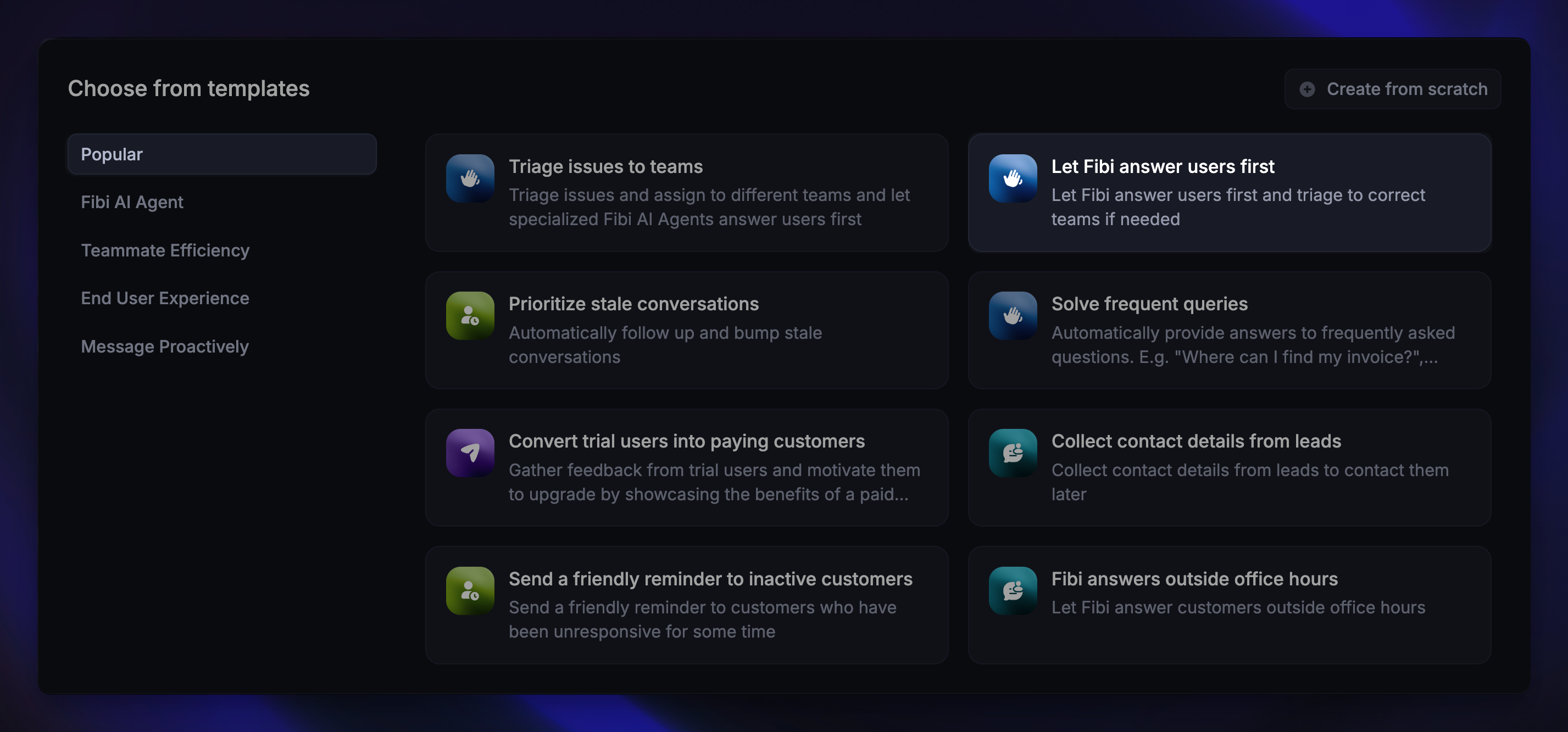 2. Click + New Workflow and select the template “Let Fibi AI Agent answer first”