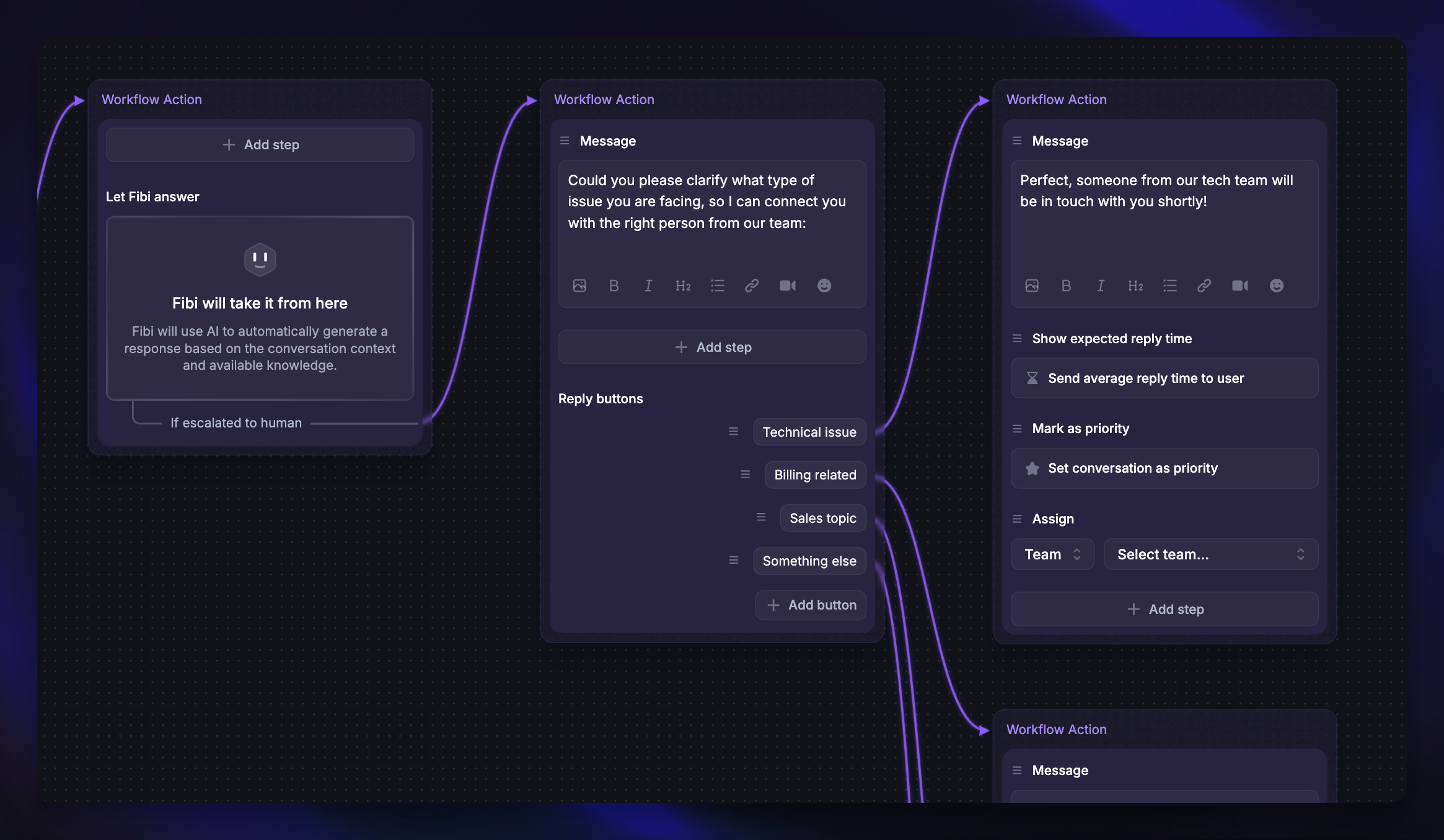2. Configure the Fibi handover – Fibi will try to answer automatically after a customer’s first message. If Fibi can’t find a solution, it’ll trigger the next Workflow step - typically routing to the correct team.
