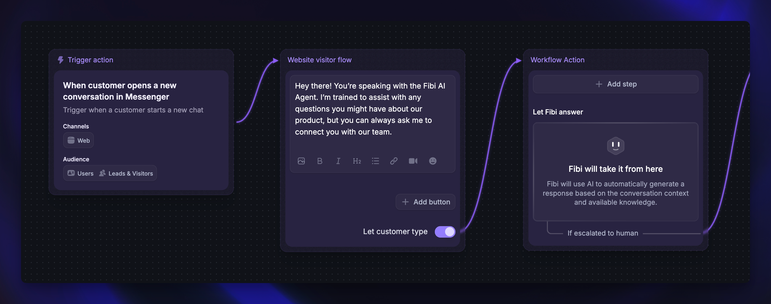 Fibi can instantly answer common questions using your connected help content. If the customer still needs a teammate, the workflow will hand the conversation over with full context - so your team can focus on complex or high-value cases.