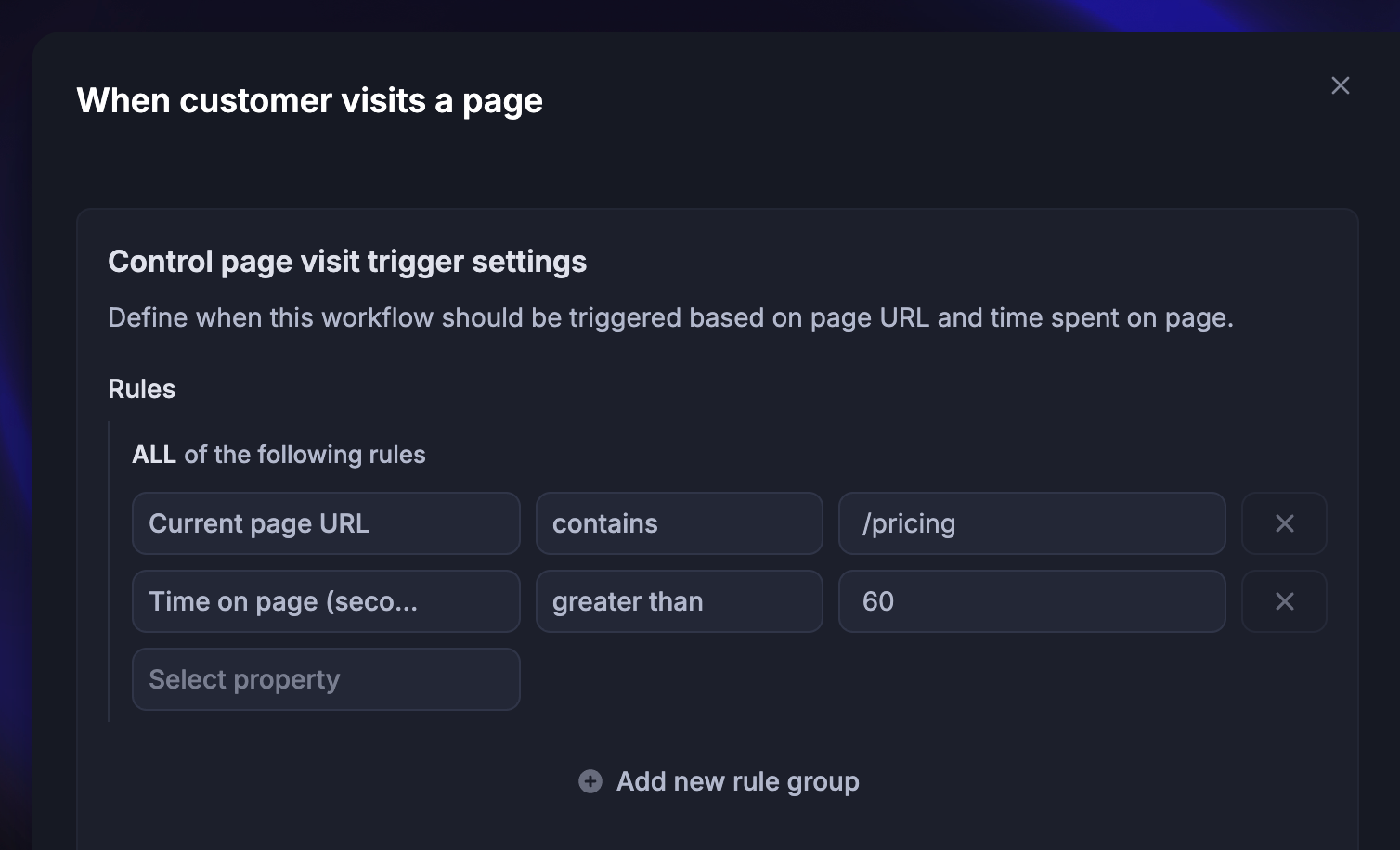 Next, you can control where a Workflow triggers with rules such as Time on page or URL. The workflow will only trigger when these conditions are met.